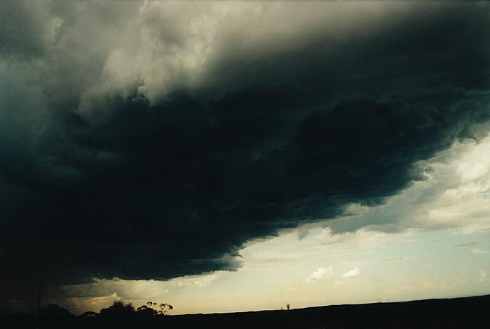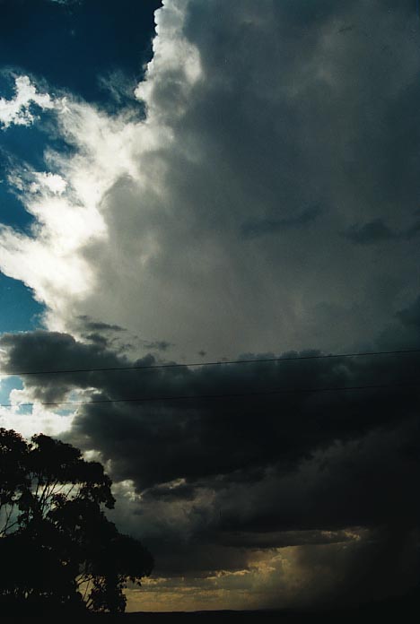 The cell near Premer, S of Mullaley, had begun to mature, so I made a dash for it realising the life-spans of these storms. It had an incredible structure with a very thick side and back sheared anvil. As spectacular as it was, the main cell was very active but the outflow domination of the storm and the foward flank downdraught again killed the storm. Again there was debri including large branches observed along the road.