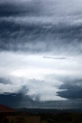 While at the lookout east of Alstonville a much larger multicell system came into view to the north. We decided to head back to my place at McLeans Ridges where the view would be expansive. The cell didn't disappoint. A lovely high contrast thunderstorm had developed and was tracking SE over the Tweed Coast about 50km to the NNE. It had incredible structure with a boiling corkscrew-like updraft on the southwest flank, and soon a shelf-like feature on the south of the base. Between 4.10 and 4.20pm it transformed into something special. Several inflow bands developed on the southern side above the now apparent wall cloud, with a beautiful twisting meso very obvious in the updraft. It was very exciting to watch this right moving supercell.