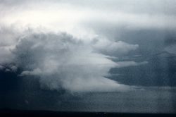 The storm was off the coast of Cape Byron and was heading in a SE direction. It turned out later it was the right mover of a split supercell. Once there I couldn't believe the structure of this thing. It looked like something out of a book! So I pulled out the Kodak DC4800 (who was on his first storm chase) and started madly taking photos! By this time the contrast of the storm against the rest of the sky was low. I handed dad the binoculars and told him to watch the base closely for anything. After a few more photos I thought I could see something - but just barely. I got the binoculars off dad and could see scud forming under the wall cloud. This was at 4.46pm. I watched it develop quickly into a very thin line barely visible through binoculars. I spent the next 20 secs trying to get a photo of this structure but couldn't as it was too far away. I jumped into the car to check the photos I'd just taken on the LCD (the screen was too dull to view in the outside light). Whilst doing this dad said he could see something. I quickly turned around to watch scuds quickly form into a funnel. It didn't descend so much from the base, it just appeared, appearing to touch the ocean very quickly. I tried taking photos with the camera's telephoto lens on, and with digital zoom (all up 12x zoom). This was at 4.48pm. I then rang Michael to let him know. He was watching the storm from his place but couldn't see the base or the funnel. Once letting him know, I took a picture at 4.49pm and another at 4.50pm and then it disappeared, as quickly as it formed.
