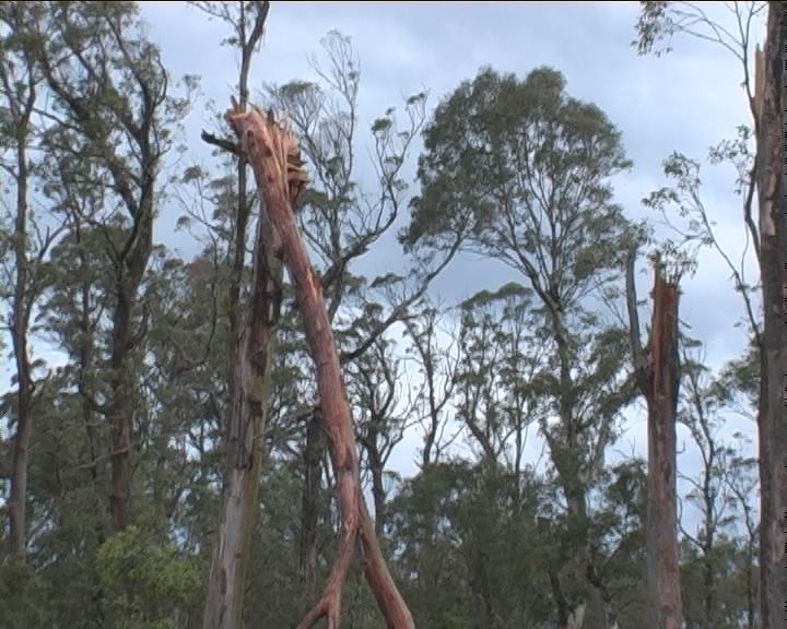 The following are some video stills of the damage to the medium density forest (note the stills of the fence line within the damage path at the entry into the forest - just slightly leaning over).