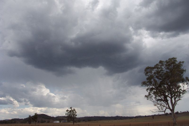 Once again we awoke to almost completely overcast skies. Anthony called and we decided to meet up at Gunnedah, about an hours drive ENE from where we were. What was scary was that when we were travelling we experienced the driest, deadest land of the whole trip. It was just depressing, dead animals in the paddocks and no grass anywhere. We met up at 10.30am at Maccas and went to Porcupine lookout, which had good views of the east and west. There was still 8/8 cloud cover and we sat around, playing a little bit of frisbee and throwing ice onto the roof till deciding to go get some lunch from town and check the net. There was only a tiny bit of flat Cu around. Sadly we couldn't get a PC at the library to use the net, so we had lunch and headed back to the lookout. When we got there the cloud had thinned out somewhat to the west and already Cjs started popping up over the ranges which had sunlight on them. Soon after we decided to chase some alright looking congestus near Coonabarabran. We eventually found ourselves in the heavy rain under the cell, and soon enough CGs started punching around nearby, picked up on the CB radio as well. After some fun driving through the rain we headed back out of the cell and around to it's southern side to watch it.
