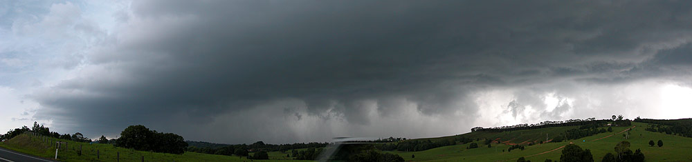 We moved north and arrived at the Lismore Airport area about 3.35pm. Massive towers had pushed up and were now overhead. CG lightning hit nearby. The structure was so awesome, particularly when the sun passed just behind the storm tops. We couldn't stay long and moved through South Lismore and out the Bangalow Road which takes an ENE route. This seemed the safest option to keep out of the storm and still observe it, but it also tracks through a lot of treed areas.