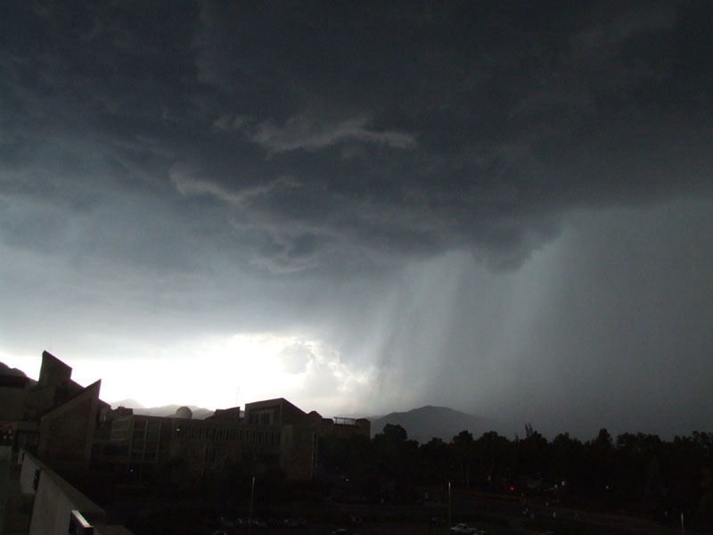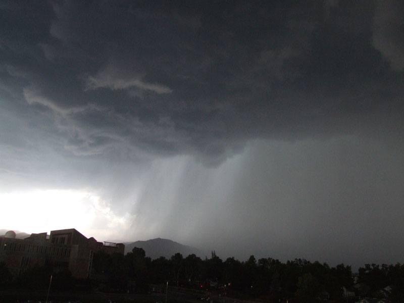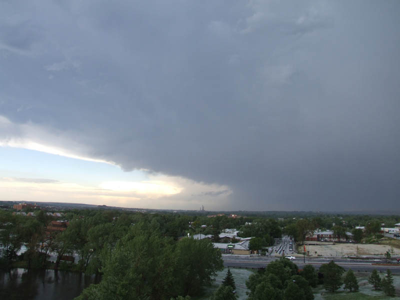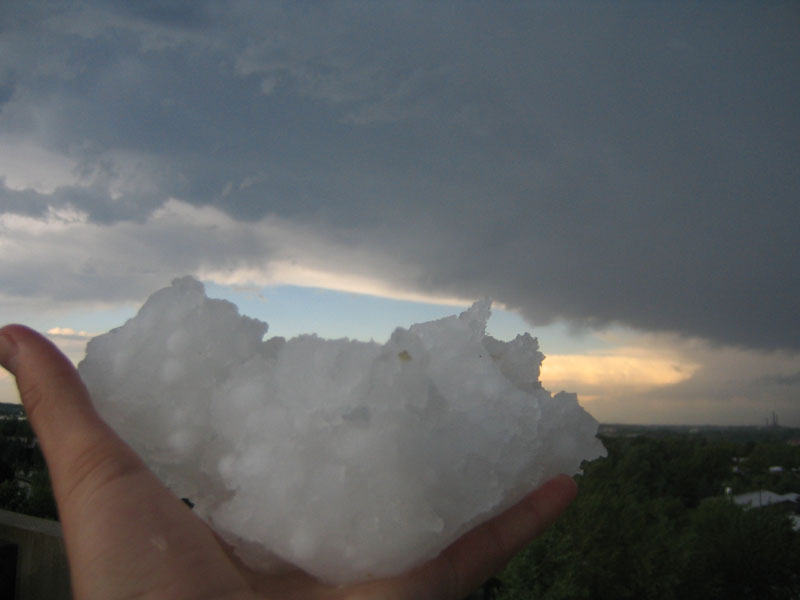 The storm was quite high based and had no wall cloud or gust front. Interestingly, the precipitation core was almost transparent for some time probably due to relatively high hail content as well as the storms high base allowing light to penetrate the precipitation core. The storm did have a very large rain free base and of interest was what appears to be a clear slot formed from the rear flank downdraft. Moderately strong south easterly inflow was observed which increased in strength with the approach of the storm. The wind quickly swung around to the north as outflow from the forward flank down draft hit with gusts of approximately 80-100 km/hr. Within the precipitation core heavy rain and a substantial amount on hail was experienced. The hail observed was very soft with the consistency more of wet snow and maximum hail size in my location was only approximately 1cm. Flash flooding also occurred throughout Boulder however no major damage was reported as a result. In other areas, hail up to 1.75 inches was reported and minor damage as a result of strong outflow winds occurred.